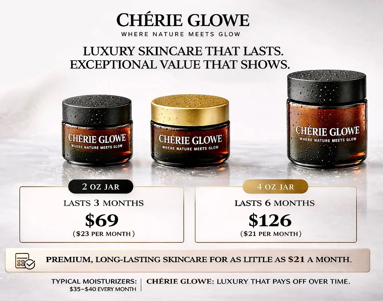 CHÉRIE GLOWE™ is different. Our formula is crafted with premium cold-pressed oils that do not evaporate like water. Instead, they create a lasting barrier that locks in deep hydration.
